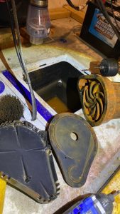 We pulled the sump pump from the pit, cleaned the exterior housing of sediment and buildup, cleaned and inspected the impeller and check valve and float switch, cleared debris from the pit then examined the exterior discharge line.